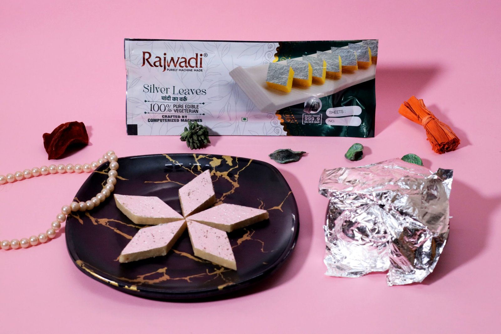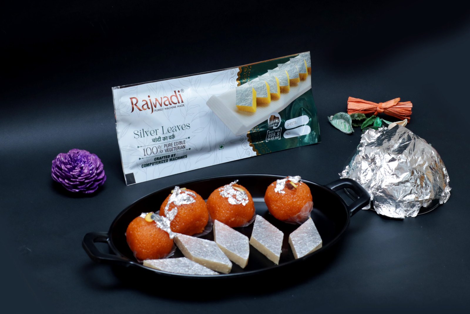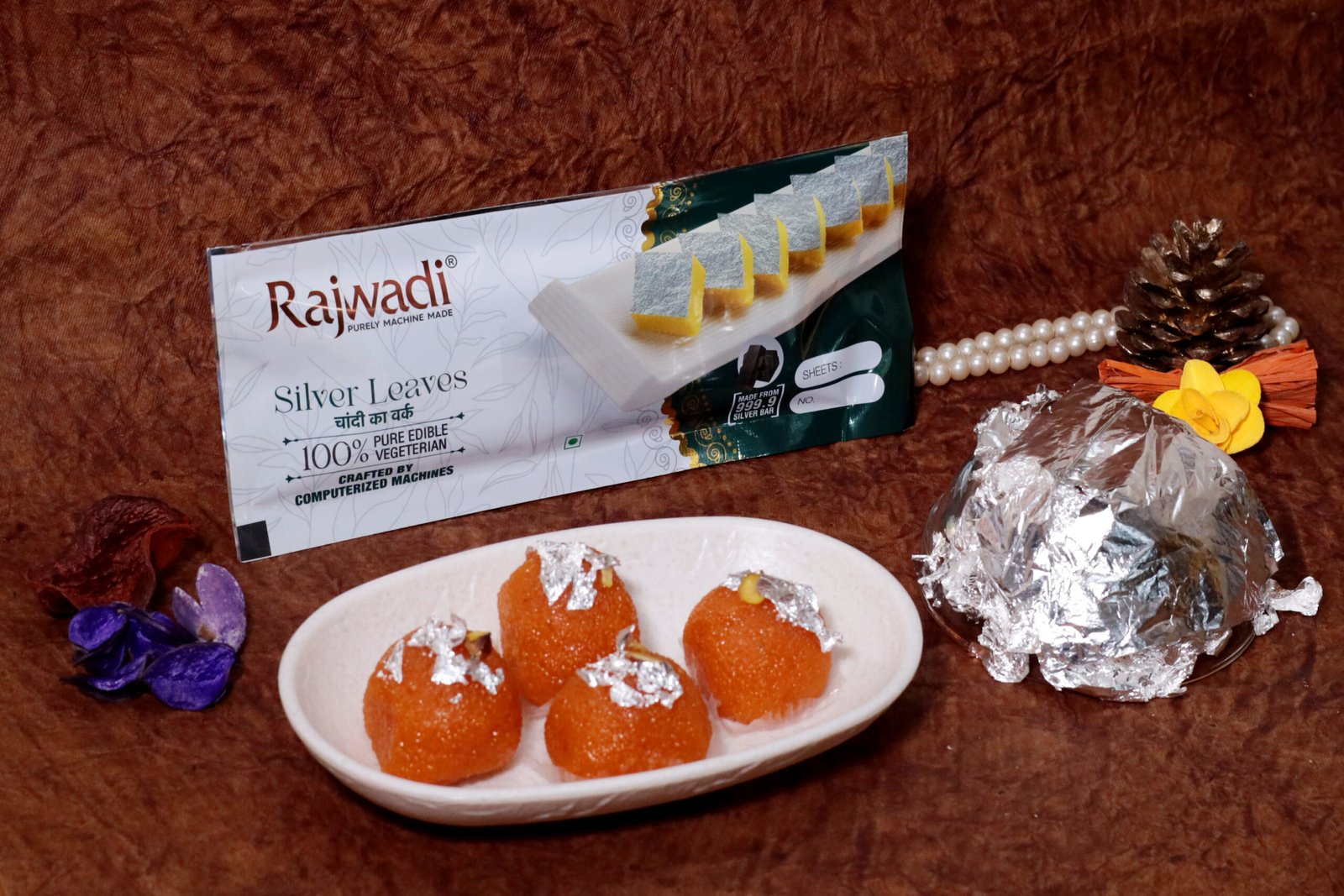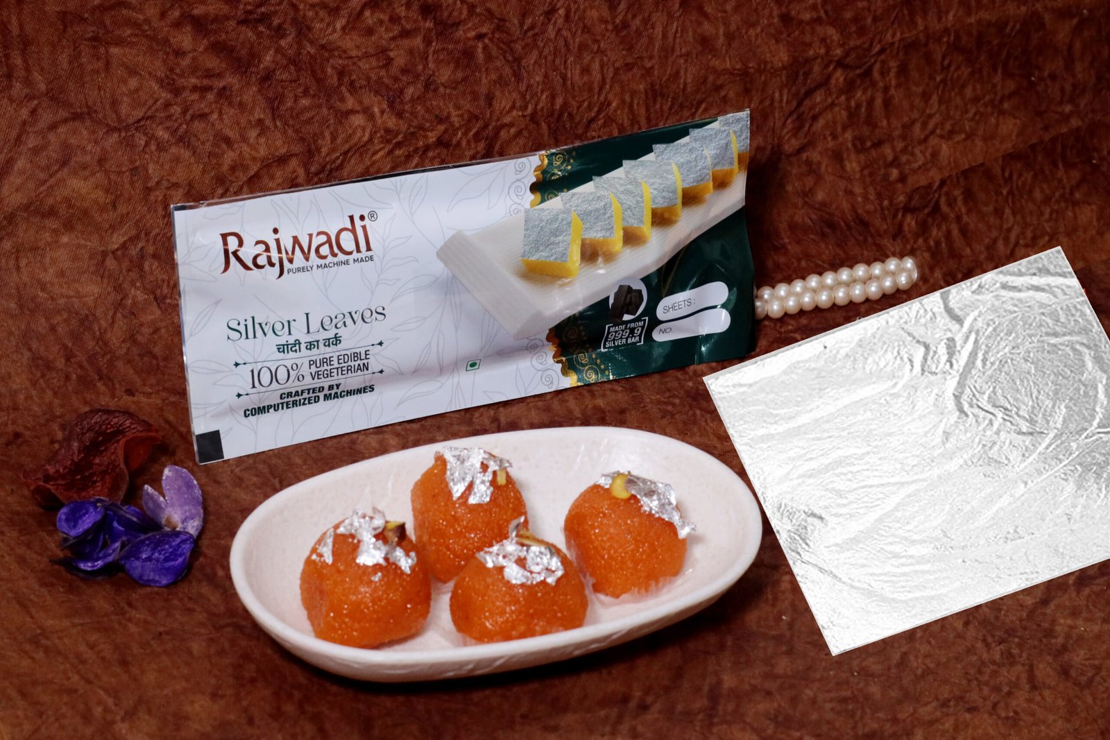Enhance your sweets with the royal shine of Rajwadi Premium Edible Silver Leaves, expertly crafted using advanced machine technology to ensure a completely animal-free and cruelty-free manufacturing process.