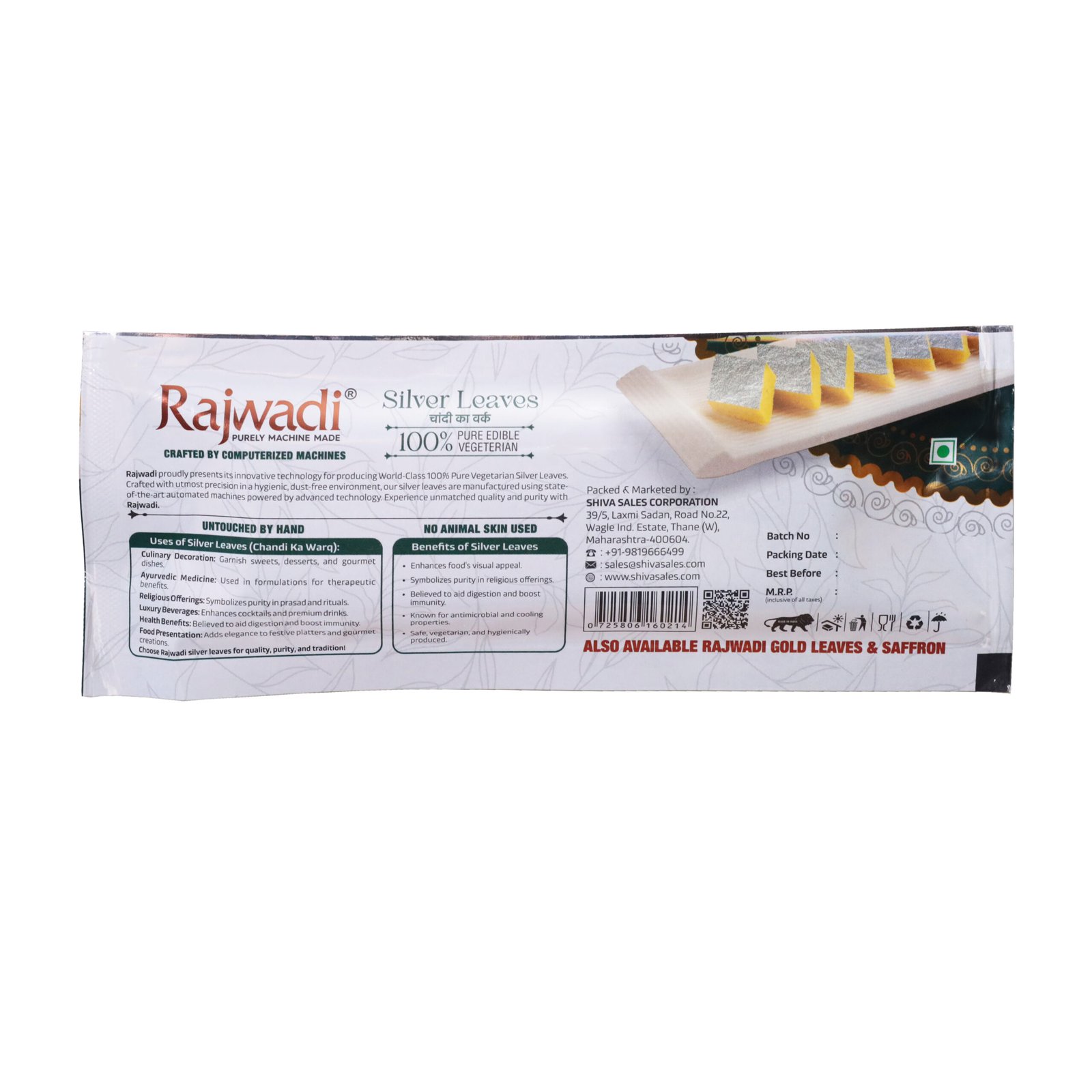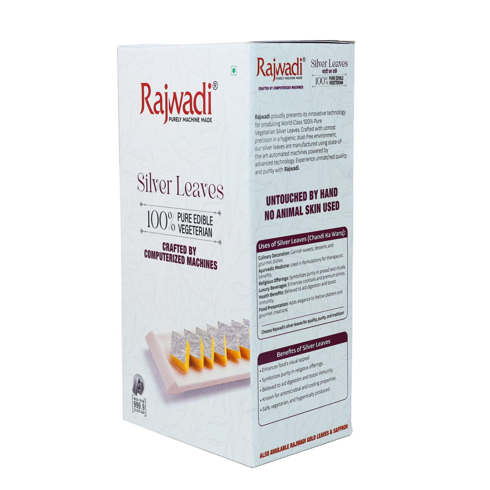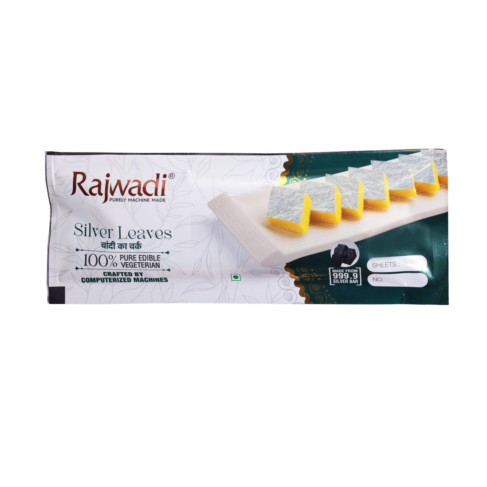 Rajwadi Edible Silver Leaves are machine-made, 100% vegetarian, and cruelty-free, crafted from 999.9% pure silver bars without harming any animals. Manufactured under strict quality supervision, these food-grade silver vark sheets are hygienically processed and ideal for decorating sweets, mithai, cakes, and bakery products.